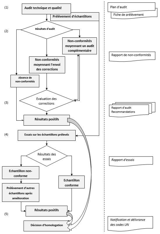 - En se basant sur les résultats positifs suite à l’audit et aux essais sur les emballages de transport des matières dangereuses, une décision d’homologation sera prononcée, une notification détaillée sera ainsi délivrée au profit de l’entreprise précisant les marquages (Codes UN) à apposer sur les différents emballages conformément à la réglementation nationale.