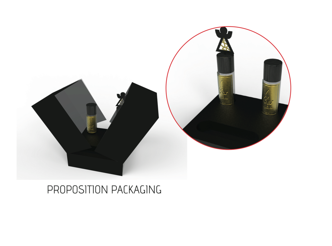 C’est un emballage de produits cosmétiques naturels pour les yeux. Il se compose de deux fioles l’une contient la poudre de khôl et la deuxième contient les épaisseurs de trait pour le traçage accompagné d’une broche artisanale à offrir. C’est un coffret innovant qui présente des produits de notre terroir et qui valorise un produit qui a tendance à disparaître. Les matériaux utilisés le carton gris-gris revêtu d’un papier noir et les bouchons en bois. Tout ceci agrémenté par la présence du Tanit qui fait référence au dieu de la fertilité et qui fait référence à nos origines carthaginoises.