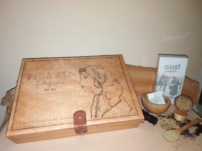 Il s’agit d’un coffret qui regroupe des différents pigmentations traditionnelle pour la coloration de cheveux (mardouma, camomille et betterave) accompagné par un paquet de 20g de Henné et d’ une bouteille de zeste de citron pour l’hydratation des cheveux après l’application et un bol et une cuillère en bois pour le mélange. La boite est de forme parallépipédique conçu en bois contre plaqué. L’assemblage de différentes parties est fait par deux charnières. La technique d’impression utilisée est la gravure sur bois et sur cuir.
