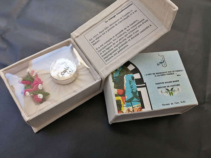 Il s’agit d’une boîte en carton gris-gris poly-sensoriel, recouvert d’un tissu et présentant une fermeture en amont. Le graphique, imprimé en numérique, est un fragment de tableaux de Paul Klee ainsi que la porte de Sidi Bou Saïd. Ainsi le coffret contient deux produits le premier est un parfum solide contenu dans une boîte en cuivre avec nickelage électrolytique et sur le couvercle est gravé le logo hanin. Le deuxième produit est une Barrette pour cheveux brodée de fleurs bougainvillées. L’emballage se distingue par son originalité son aspect traditionnel ce qui contribue à valoriser les produits